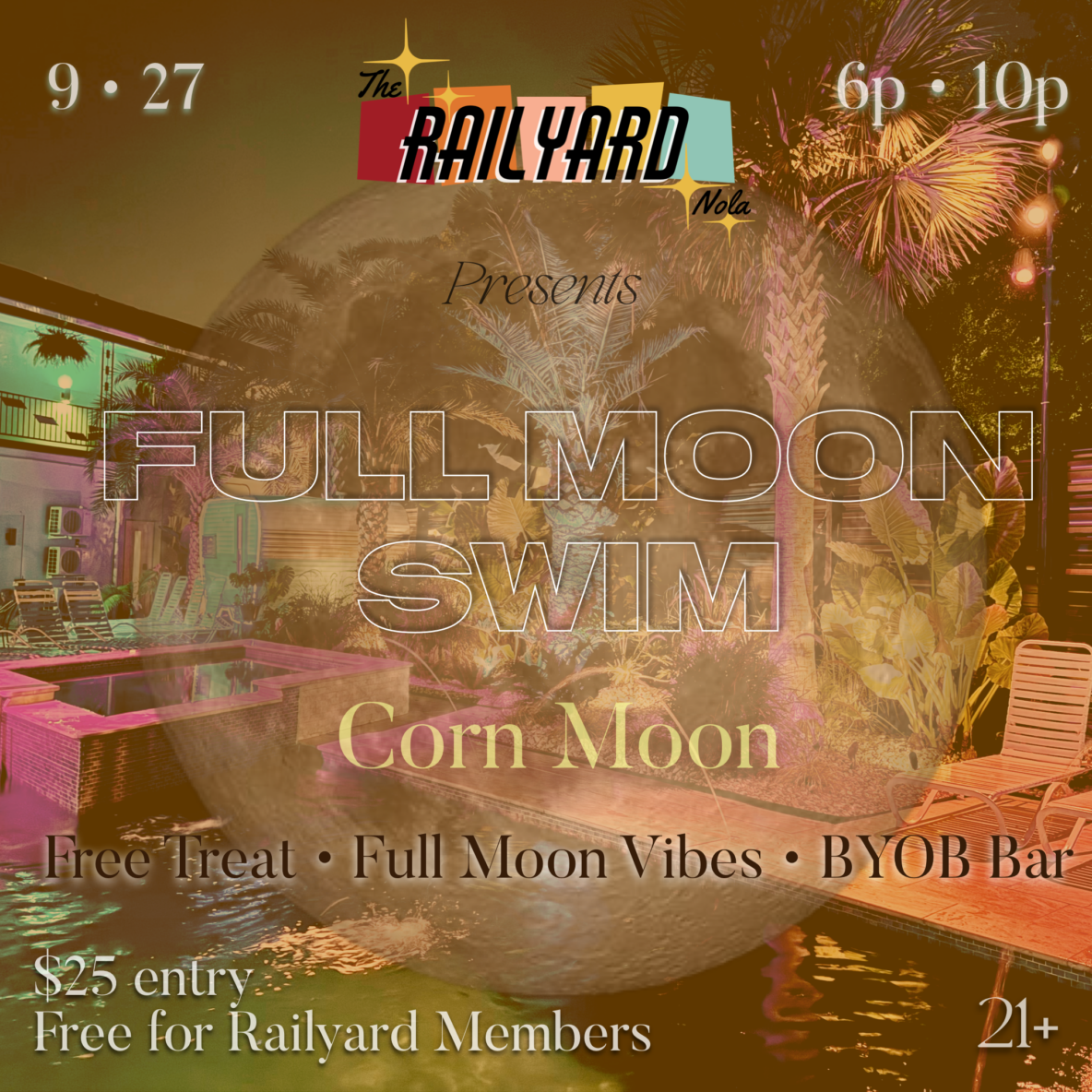 Our Full Moon Swims are free to members and registered Inn guests and $25 for a daily membership pass guests, which is available via our website only. No at the door registrations, all guests subject to vetting.