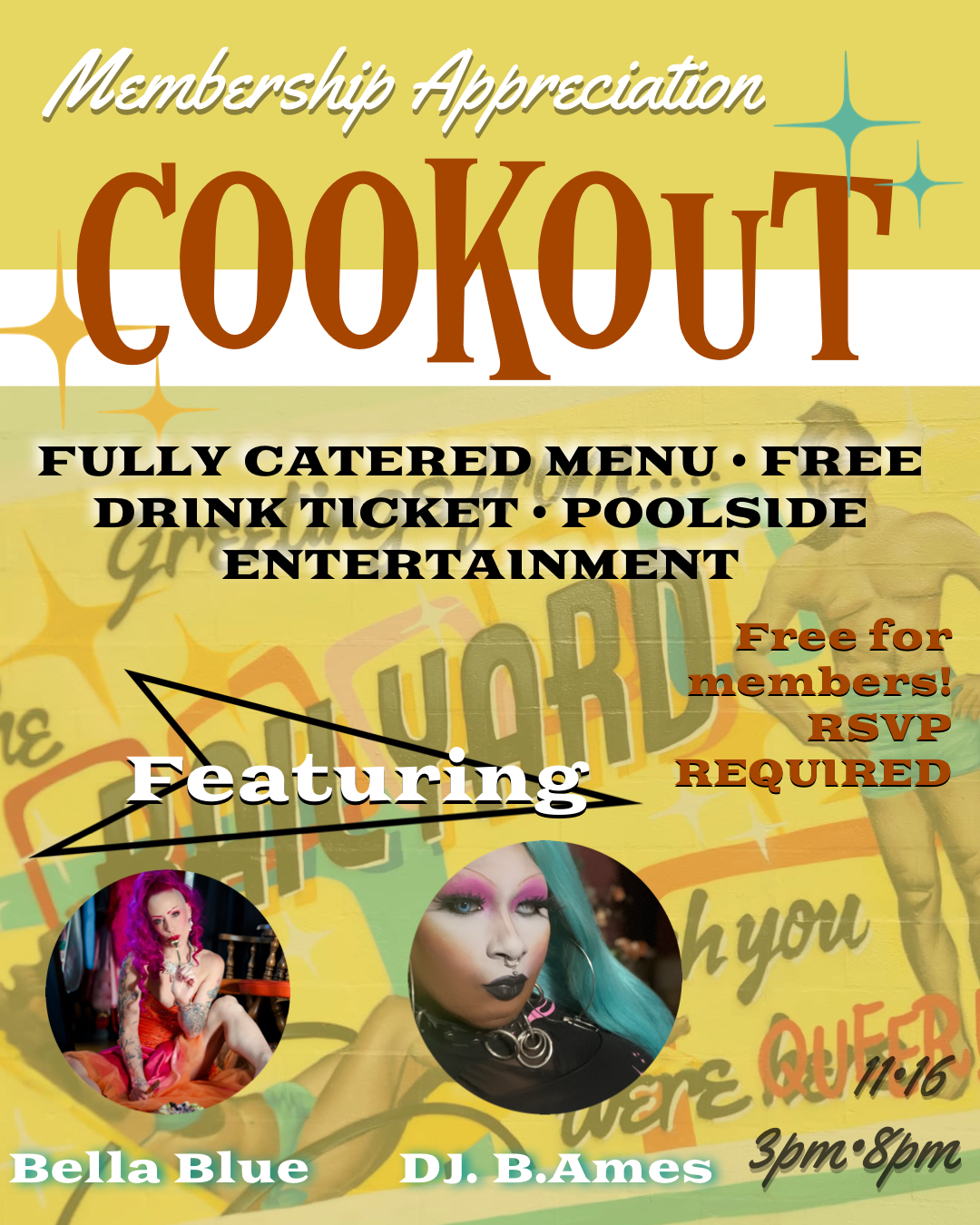 A members-only appreciation party and cookout featuring beats by DJ B.Ames (EEK!!), full bar, heated pool and a pool-side lounge act by the one and only Bella Blue!! Fully catered featuring a Mediterranean styled bites (I mean seriously), each member will get ticket for one free beer or wine at the bar on top of free food and deserts! Members can bring one non-member guest for $15 but members are free!! Looking forward to mixing mingling and of course stuffing ourselves with you!
